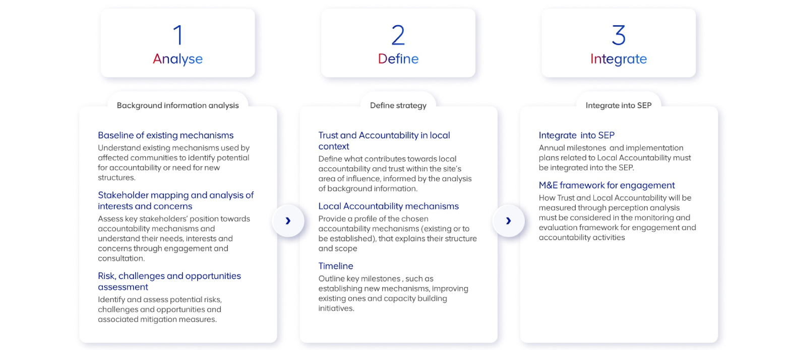 Trust and Accountability in local context: The Strategy should present what contributes towards local accountability and trust within the site’s area of influence, informed by stakeholder analysis and the site’s external context review. Each site should make efforts to understand what accountability and trust means to the stakeholders of the area of influence, as this will guide the definition of mechanisms and well as inform the design of the perception analysis.