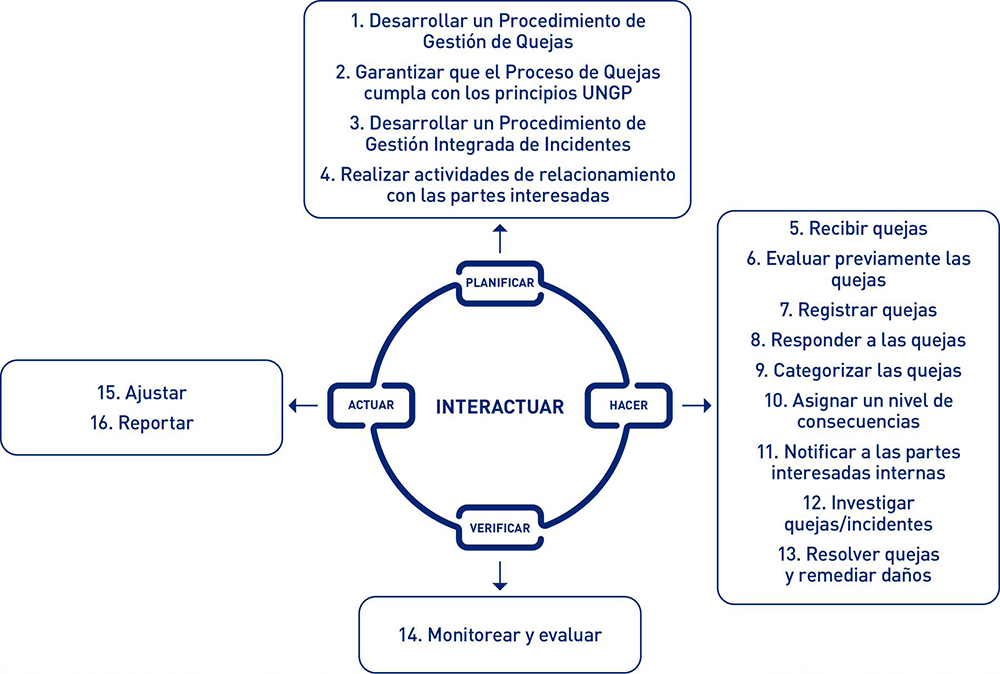 El Social Way se basa en el proceso de gestión Planificar, Hacer, Verificar, Actuar (PDCA). En consecuencia, la orientación que se proporciona en esta subsección está estructurada de manera correspondiente. A los efectos de esta sección, el abarca el proceso de diseño, implementación y monitoreo de la gestión de quejas e incidentes.