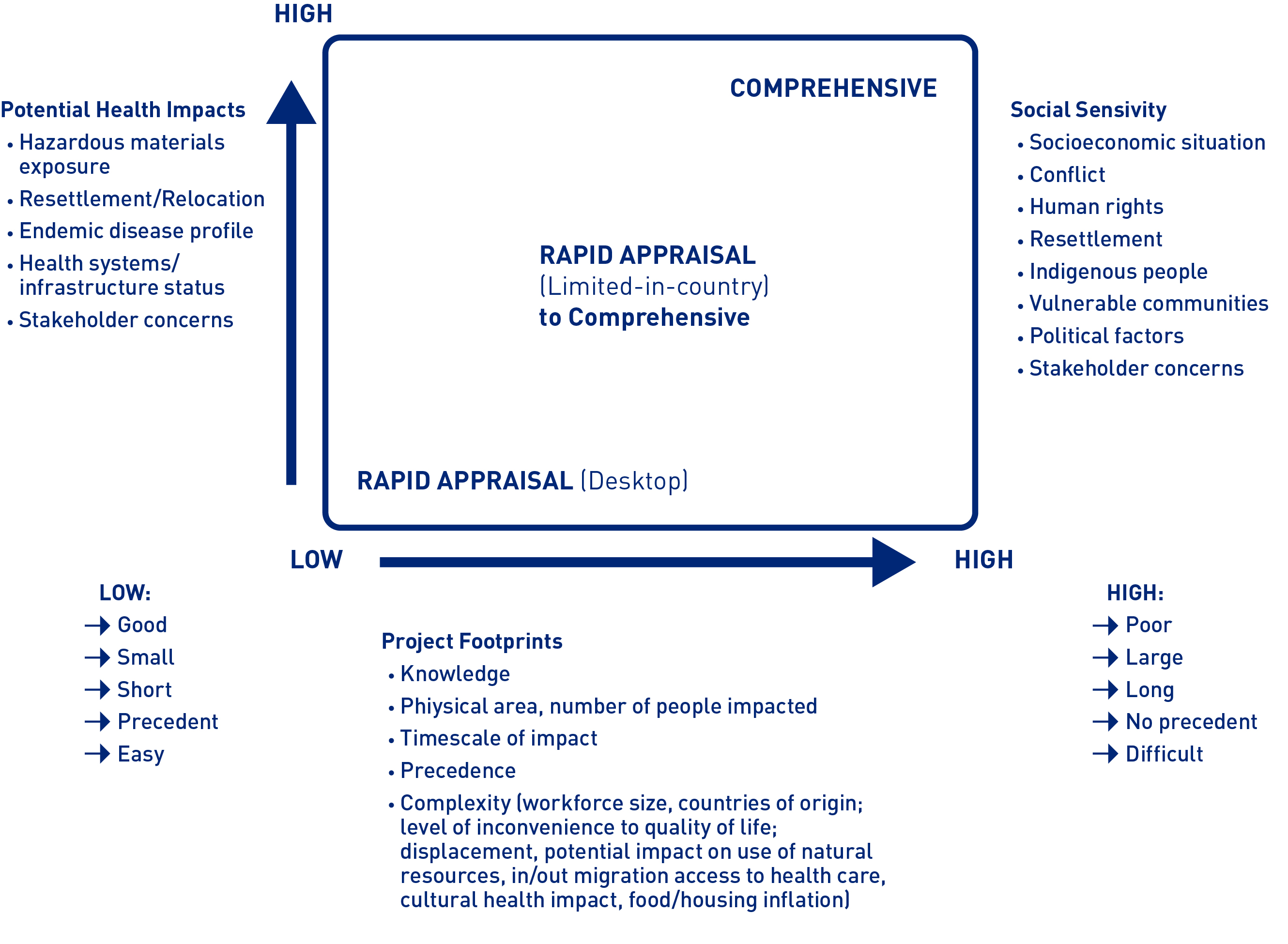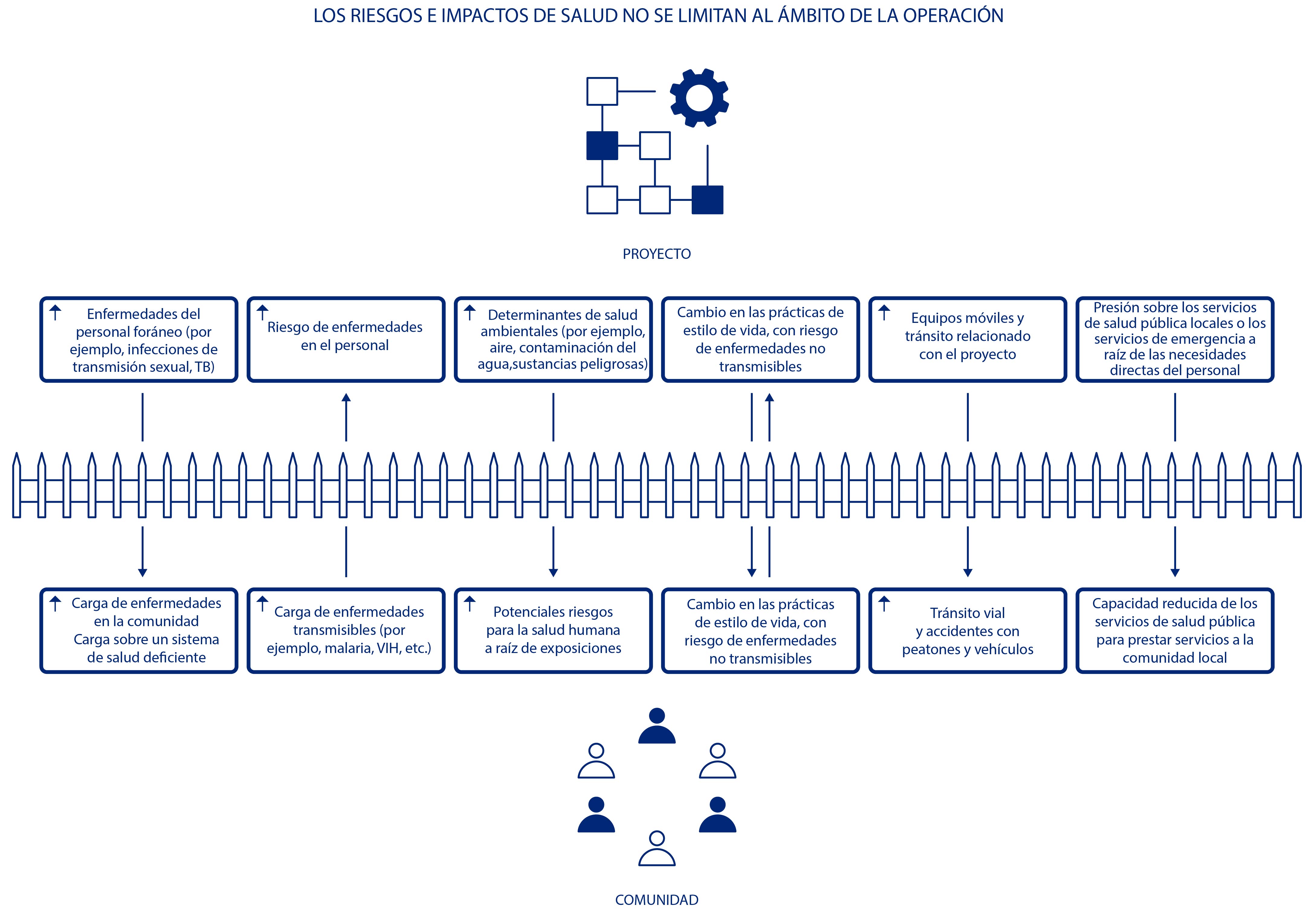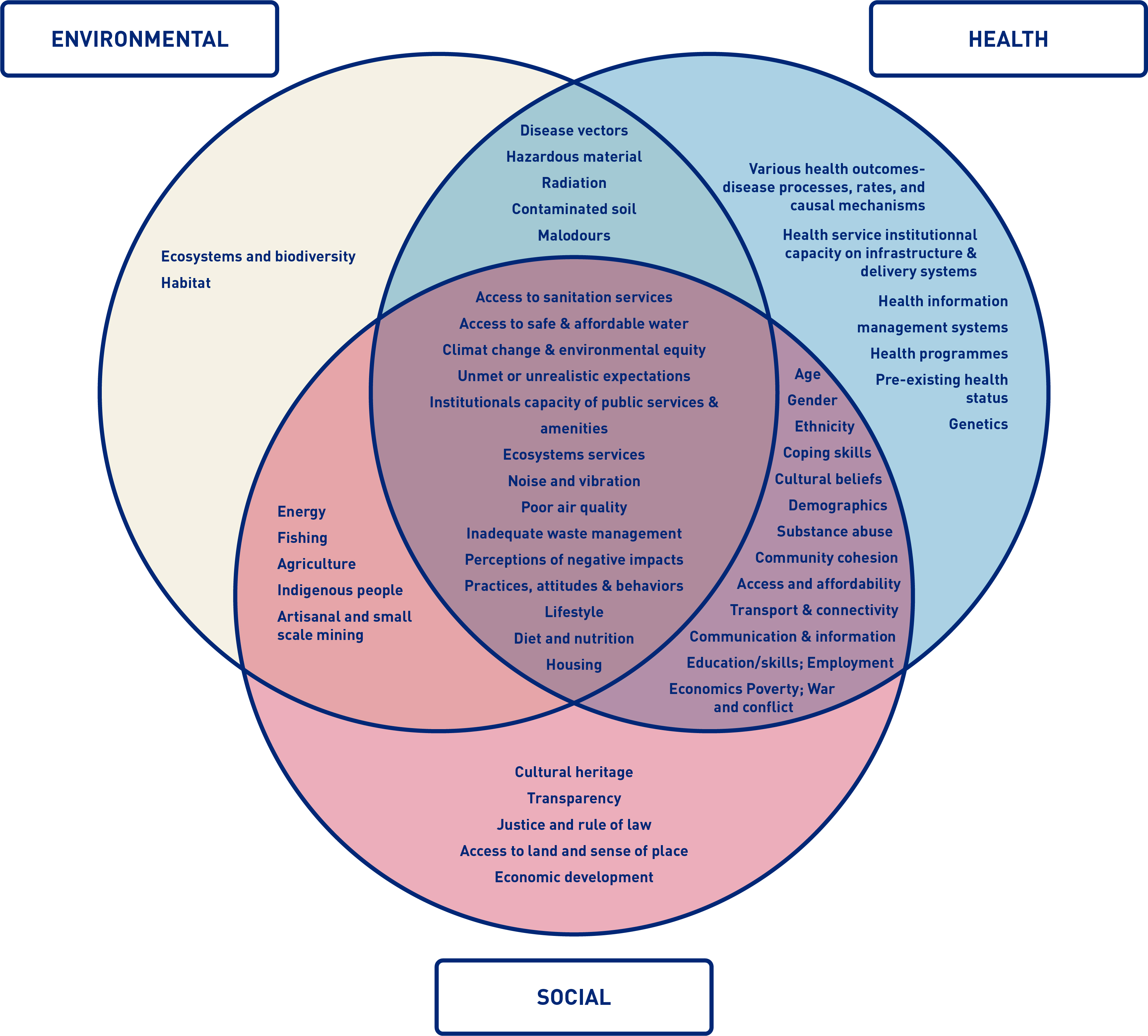 La considera las formas en que un sitio o proyecto puede crear peligros de salud e impactos de salud asociados, así como los factores de promoción de la salud y las oportunidades de salud asociadas, y es aplicable tanto al análisis de los impactos negativos y riesgos como a las oportunidades de desarrollo socioeconómico asociadas con la (consulte la Sección 4A y lo que se explica más adelante en este documento).