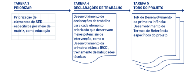 O Termo de Referência do projeto deve ser usado para a contratação de uma organização para implementar o projeto, onde necessário. A equipe Desenvolvimento Socioeconômico deve participar ativamente no processo de contratação, desde desenvolver os documentos da licitação, revisar e avaliar propostas, até entrevistar potenciais parceiros na implementação dos projetos. Além de contratar um parceiro, as propostas também podem ser usadas como uma competição para ver quem apresenta a solução mais adequada para o problema, bem como um meio para obter aconselhamento especializado adicional sobre soluções de intervenção eficazes. Ver Figura 4A.3 para obter uma visão geral do processo de priorização de elemento para Proposta de Trabalho e Termo de Referência do projeto.